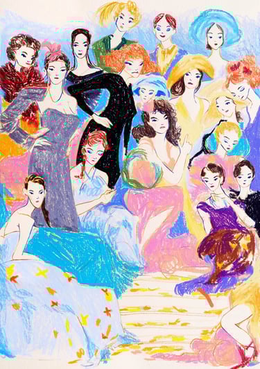 Fashion illustration is at the heart of my artistic journey. I work mostly with colored pencils and pastels to capture movement, style, and emotion in every drawing. I also love to embroider beads and sequins on paper, I'm truly a mixed media artist!