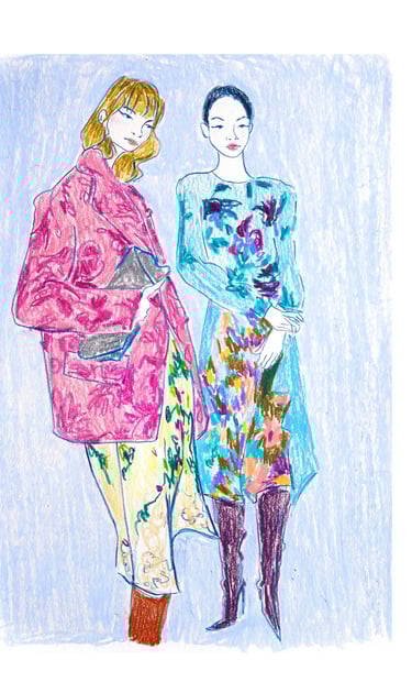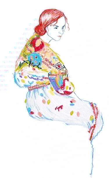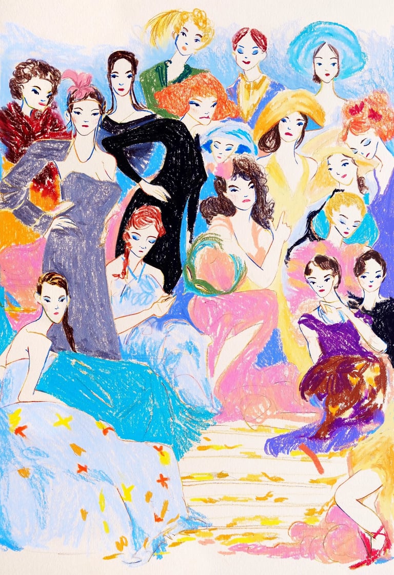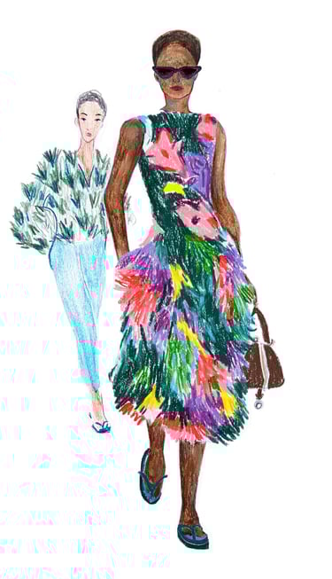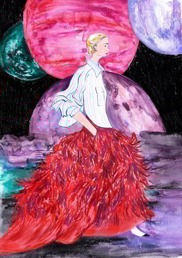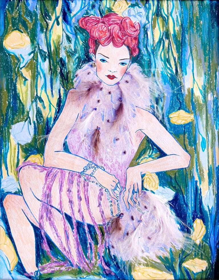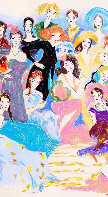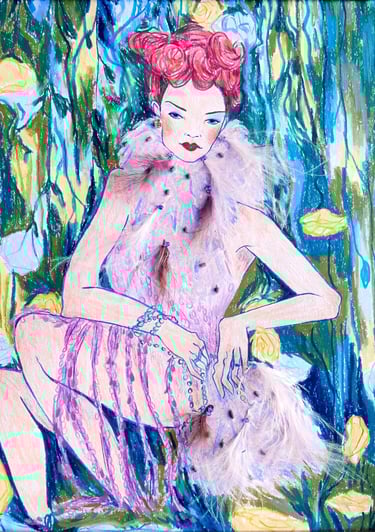 Fashion illustration is at the heart of my artistic journey. I work mostly with colored pencils and pastels to capture movement, style, and emotion in every drawing. I also love to embroider beads and sequins on paper, I'm truly a mixed media artist!